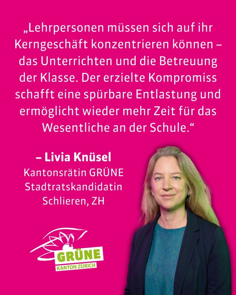 Wir Grüne setzen uns seit Jahren für eine ressourcengerechte Ausstattung des Lehrberufs ein. Frühere Vorstösse im Kantonsrat zur Erhöhung der Lektionenvorbereitung auf 62 Stunden sowie der Klassenlehrpauschale auf 200 Stunden haben wir aktiv unterstützt. Auch unser Minderheitsantrag zur regierungsrätlichen Vorlage sah erneut 200 Stunden vor – damit wollten wir unser stets konsequentens Eintreten für faire Arbeitsbedingungen untersrtreichen. Wir hielten aber nicht daran fest, weil wir anerkennen, dass selbst berechtigte Höchstforderungen unter den heutigen Rahmenbedingungen nicht vollständig umsetzbar sind.
